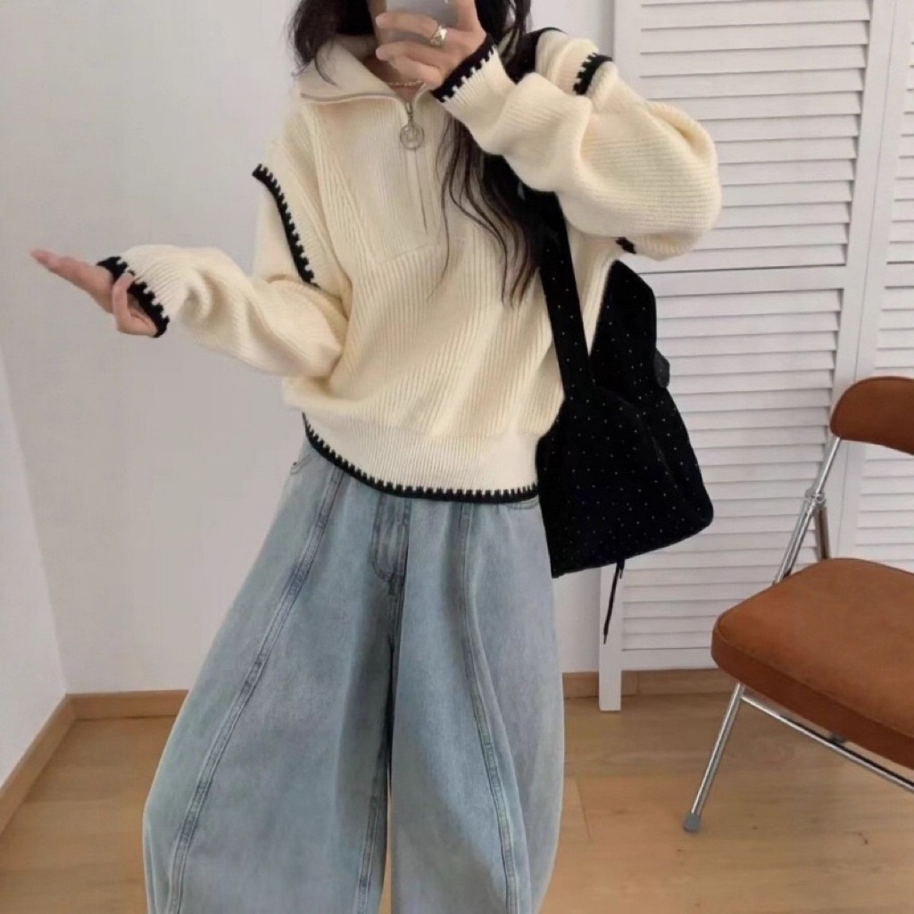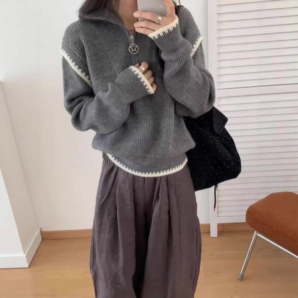 撞色拼接高領拉鍊毛衣